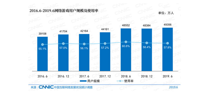截至2019年6月,我国网络游戏用户规模达4.94亿,较2018年底增长972万,占网民整体的57.8%;手机网络用户规模达4.68亿,较2018年底增长877万,占手机网民的55.2%。